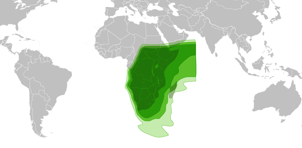 Tschad, Sudan, Saudiiarabien, Oman, Jemen, Eritrea, Äthiopien, Somalia, Kenia, Tansania, Mosambik, Madagaskar, Simbabwe, Botsuana, Namibia, Südafrika, Sambia, Gabun, Angola, Demokratische Republik, Kongo